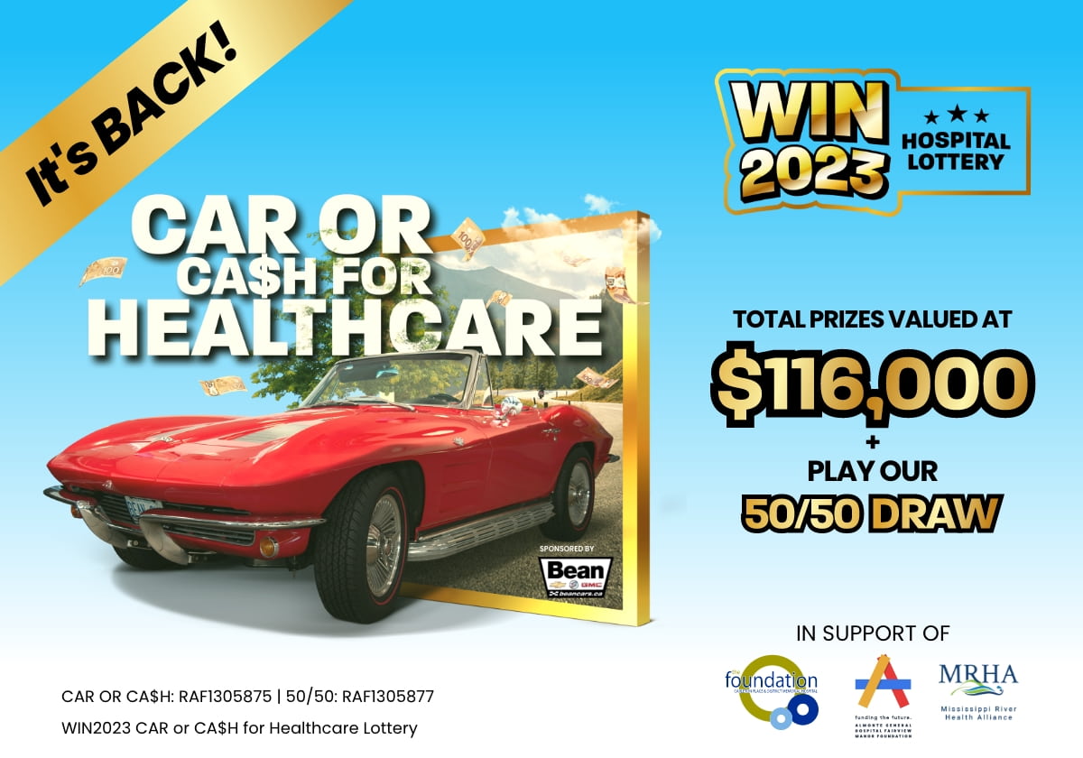 The WIN2023 Car or Ca$h for Healthcare Hospital Lottery is Back! Now Bigger and Better than Ever with a Grand Prize of a ‘63 Convertible Corvette Stingray OR $100,000 CA$H (Carleton Place, ON) The Almonte General Hospital Fairview Manor Foundation (AGH-FVMF) and Carleton Place & District Memorial Hospital Foundation (CPDMHF) today announced that the WIN2023 Car or Ca$h for Healthcare Lottery is back, bigger and better than ever, with over $116,000 worth of prizes. Eager ticket buyers have the chance to win either a vintage 1963 convertible Corvette Stingray, donated by Keith Bean, owner of Bean Chevrolet Buick GMC Corvette (Bean), or take $100,000 in CA$H. This year’s lottery also features five exciting early-bird prizes and a bonus cash prize through an additional 50/50 draw. Tickets will be sold between March 31 and June 30, 2023 with the two local hospital foundations sharing equally in the net proceeds. Available at WIN2023.ca, Bean, AGH-FVMF and CPDMHF offices, tickets cost one for $25, five for $100, or 20 for $300. Tickets will also be sold at community events and at the various early-bird prize sponsor locations. Exact dates, times and locations will be promoted during the campaign. “I can’t think of a more exciting way to support our two local hospitals than raffling off this dream car,” said Bean. “For my family, staff, customers and neighbours, access to quality health care close to home is absolutely vital, so supporting this lottery is one great way that I can do that. Everyone involved is really hoping for a sellout so that both hospitals have a financial win-fall to invest in vital medical equipment and our new ER.” According to Carol Anne Esnard, Chair of the Allied Boards of Directors of AGH and CPDMH, “Community funding for both our hospitals through the two different foundations has a major impact on patient care. We count 100% on funds received through fundraising activities like this lottery to purchase replacement and new medical equipment. At Almonte General Hospital our current focus is on bringing a CT Scanner to the Hospital. At Carleton Place & District Memorial Hospital we are raising funds for our new Emergency Department. Support of WIN2023 will help ensure that patients benefit from new modern facilities and state-of-the-art medical equipment. The Allied Boards, Staffs and Physicians of both hospitals want to thank everyone involved, especially Keith for his generosity and community leadership.” As well as the grand prize, five early-bird prizes are also up for grabs including: two $2,000 shopping sprees thanks to both Mitchell’s and Jonsson’s Independent Grocery stores, a Junior ATV provided by Throttle Power Sports, a Louisiana Grill donated by the Beckwith Butcher and a set of Milwaukee Tools courtesy of Levi Home Hardware. Early-bird winning tickets remain in all future draws so tickets should be purchased early to get in on all the winning action. All draw dates and times are available on the WIN2023.ca website. WIN2023 ticket buyers are also eligible to participate in the bonus 50/50 draw. Tickets for this exclusive 50/50 are 50 for $10, 120 for $20, or 250 for $40 (players must purchase a WIN2023 ticket at the same time to be eligible to participate in the 50/50). The grand-prize draw will be held at the Pakenham Canada Day Parade, Friday, June 30 at 8 p.m. The winners’ names for the all prizes and the 50/50 will be posted at WIN2023.ca and promoted on the two foundations’ social media sites. Tickets buyers must be 18 years or older and residents of Ontario. Lottery license No. RAF1305875 and 50/50 license No. RAF1305877.