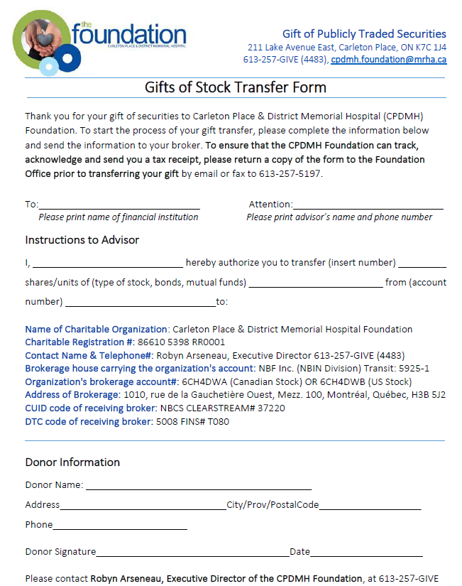 For more information about donations of Gifts of Stock and Securities to support the Carleton Place & District Memorial Hospital, please contact: